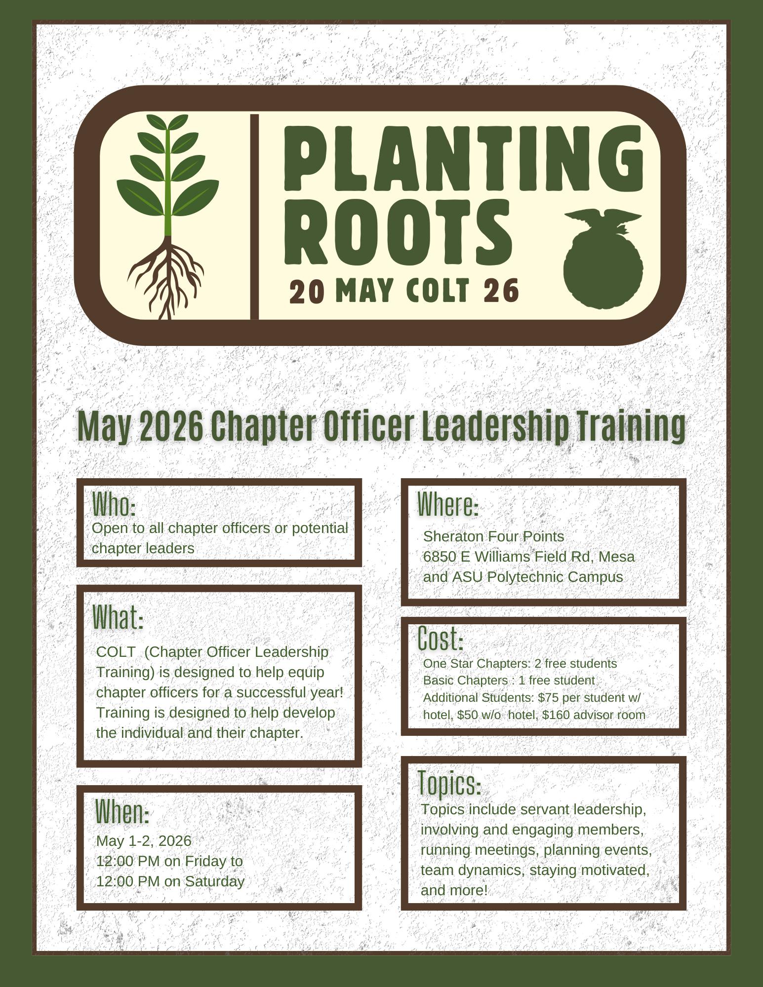 Chapter Officer Leadership Training (COLT) focuses on helping chapter officers understand their role and feel motivated to take opportunities that come their way while serving as an officer. May COLT will be held at the Four Points by Sheraton and ASU Polytechnic Campus.